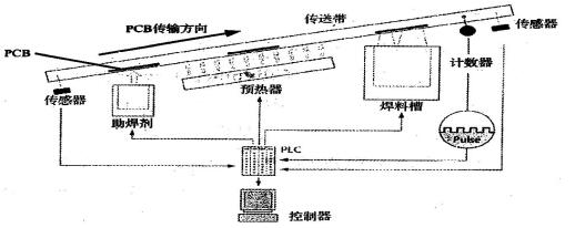 下面以雙波峰焊機的工藝流程為例,來說明波峰焊原理(見圖3-1)。