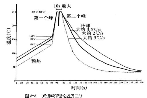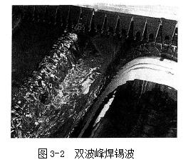 印制板繼續(xù)向前運行,印制板的底面首先通過第一個熔融的焊料波。第一個焊料波是亂波(振動波或紊流波),將焊料打到印制板的底面所有的焊盤、元器件焊端和引腳上;熔融的焊料在經(jīng)過焊劑凈化的金屬表面上進行浸潤和擴散。之后,印制板的底面通過第二個熔融的焊料波,第二個焊料波是平滑波,平滑波將引腳及焊端之間的連橋分開,并去除拉尖(冰柱)等焊接缺陷(圖3-2是雙波峰焊錫波)