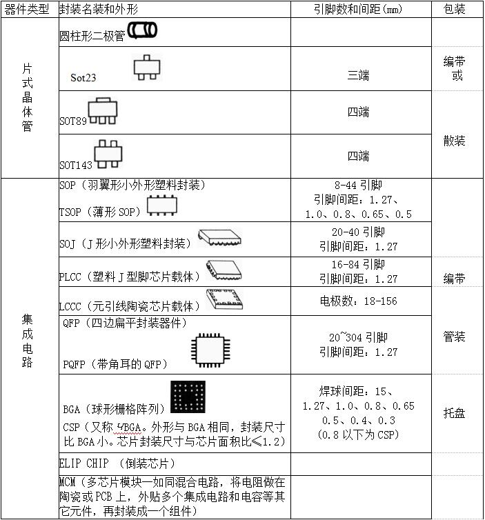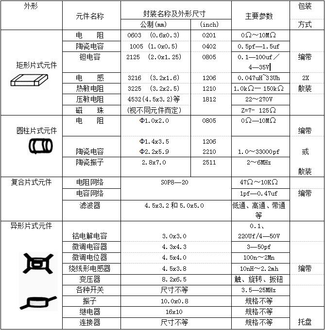 4.2表面組裝元件(SMC)的外形封裝、尺寸主要參數(shù)及包裝方式(見表4-1)