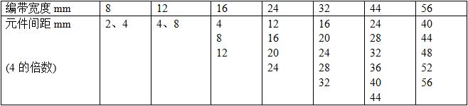 紙帶和塑料帶的孔距為4mm,(1.0*0.5mm以下的小元件為2mm),元件間距 4m的倍數(shù),根據(jù)元器件的長(zhǎng)度而定。編帶的尺寸標(biāo)準(zhǔn)見表4-4。