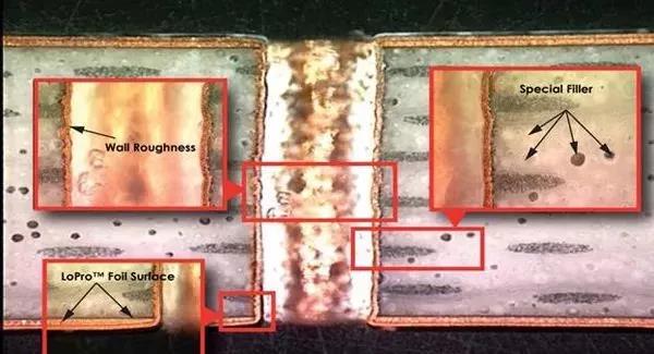 由于微球的存在,電路加工結(jié)構(gòu)的外觀——例如從一個(gè)導(dǎo)電層到另一個(gè)導(dǎo)電層的金屬化過(guò)孔(PTH)——看起來(lái)比沒(méi)有采用這種特殊介質(zhì)填料的傳統(tǒng)的線路板材料,制作形成的金屬化過(guò)孔要更加粗糙。可能看起來(lái)是這樣的,又或者是有什么其他的擔(dān)憂(yōu),畢竟因?yàn)椴捎弥锌瘴⑶蛱盍系木€路板在做金屬化過(guò)孔時(shí)孔壁非常的粗糙。但一系列的研究表明,無(wú)論是在射頻頻率下,還是對(duì)5G無(wú)線網(wǎng)絡(luò)的毫米波頻率下,中空微球填料對(duì)金屬化過(guò)孔的影響純粹是表面外觀上的,它并不會(huì)影響電路的性能或金屬化過(guò)孔的可靠性。