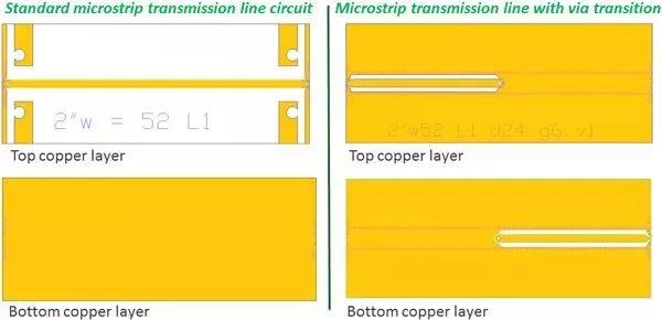 圖3. 這些電路是用于評(píng)估金屬化過(guò)孔孔壁表面粗糙度對(duì)高頻下RF性能的影響的電路設(shè)計(jì),左圖是標(biāo)準(zhǔn)的微帶傳輸線,右邊是具有金屬化過(guò)孔的微帶線電路。