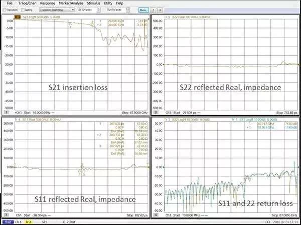 圖4. 這是網(wǎng)絡(luò)分析儀測(cè)試得到的不同電路且具有不同壁表面紋理的金屬化過(guò)孔的S參數(shù)的示例,分別包括頻域和時(shí)域。