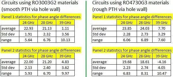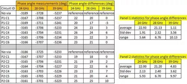 圖5中的電路ID可以顯示電路來(lái)自哪個(gè)12×18英寸的大板,以及該板上的電路ID編號(hào)。例如,P1 C4來(lái)自板1,電路編號(hào)為4號(hào)。電路彼此之間互相遠(yuǎn)離并均勻地分別在12×18英寸的板上,以保持一致性。某些變化是可以事先預(yù)料到的,因?yàn)樗鼈儗?duì)相位角的差異非常敏感。某些變化是由于PCB制造過(guò)程而造成的,而不是金屬化過(guò)孔壁粗糙度的原因,包括導(dǎo)體寬度的變化,鍍銅厚度的變化和鉆孔質(zhì)量的變化。此外,金屬化過(guò)孔周?chē)目p隙由于PCB的正常制造公差也會(huì)出現(xiàn)一些變化。同樣,每個(gè)板上的微小材料變化,如Dk值的微小變化,也可能導(dǎo)致相位的變化??紤]到圖5所示的測(cè)試值,在39 GHz時(shí)相位數(shù)據(jù)的可重復(fù)性標(biāo)準(zhǔn)差小于±1.2度,這是非常好的。