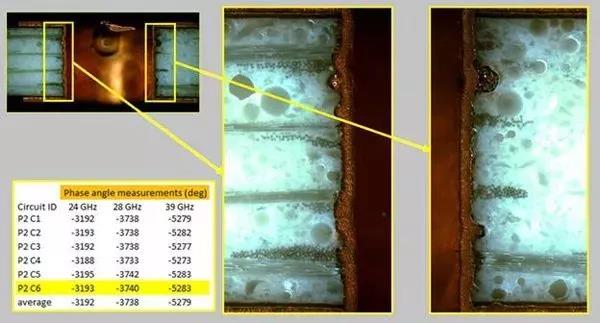 圖7.RO4730G3材料的從頂層到底層線路的金屬化過(guò)孔孔壁(較為粗糙)的表面特征和3個(gè)毫米波頻率下相位測(cè)量結(jié)果。